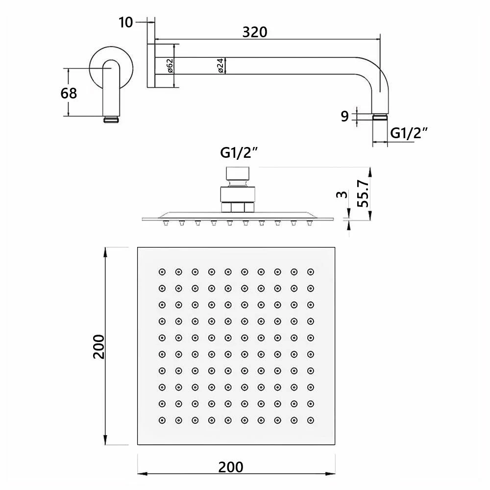 - Shower Head Dimensions: W 200mm x L 200mm x H 10mm