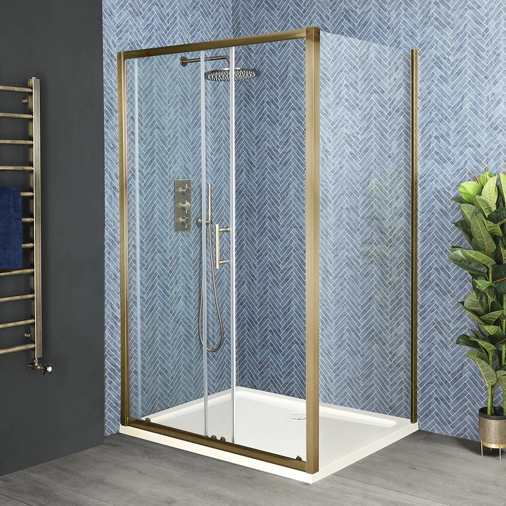 Revamp your bathroom and create a stand-out look with the Milano Auro brushed gold corner sliding door shower enclosure, complete with tray and fast-flow waste.