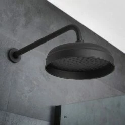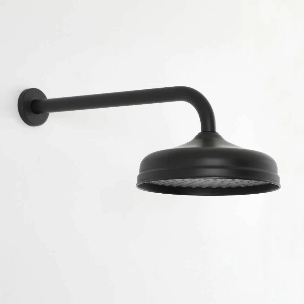 Further elevate the look of your vintage style bathroom and enjoy a luxurious shower experience with the Milano Elizabeth 200mm black traditional apron shower head, complete with wall-mounted arm.