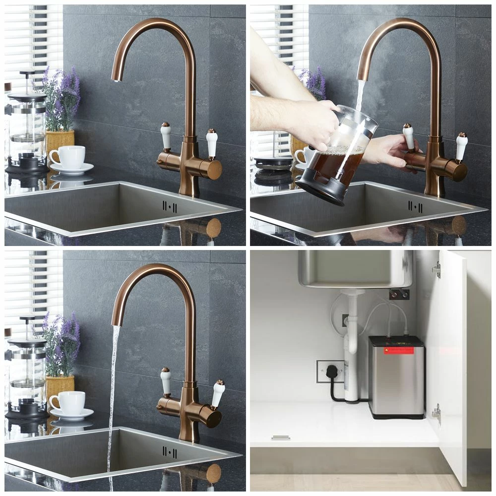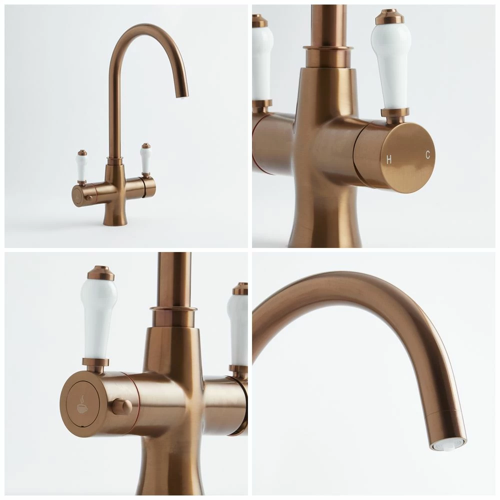 The Elizabeth instant boiling water tap incorporates a child safety lock for peace of mind and a 360° swivel spout for added convenience. Made from solid brass, it features a brushed copper finish and white ceramic lever handles, which provide effortless control. The left handle delivers boiling hot water, while the right handle operates the normal hot and cold water.