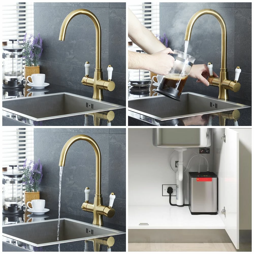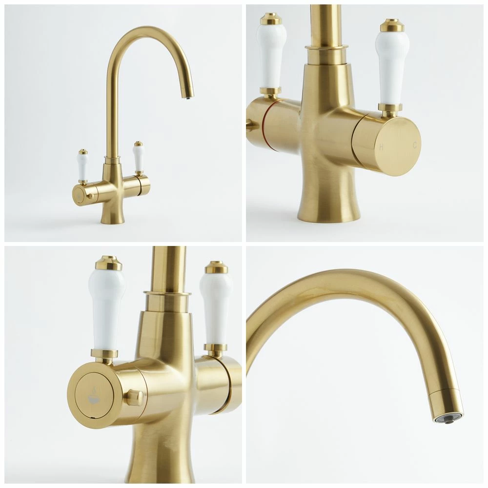 This boiling hot water kitchen tap features a child safety lock for peace of mind and a swivel spout for added convenience. It has a solid brass construction and a gold finish for a touch of elegance. The white ceramic lever handles provide effortless control – the left handle dispenses boiling hot water, while the right handle operates the normal hot and cold water.