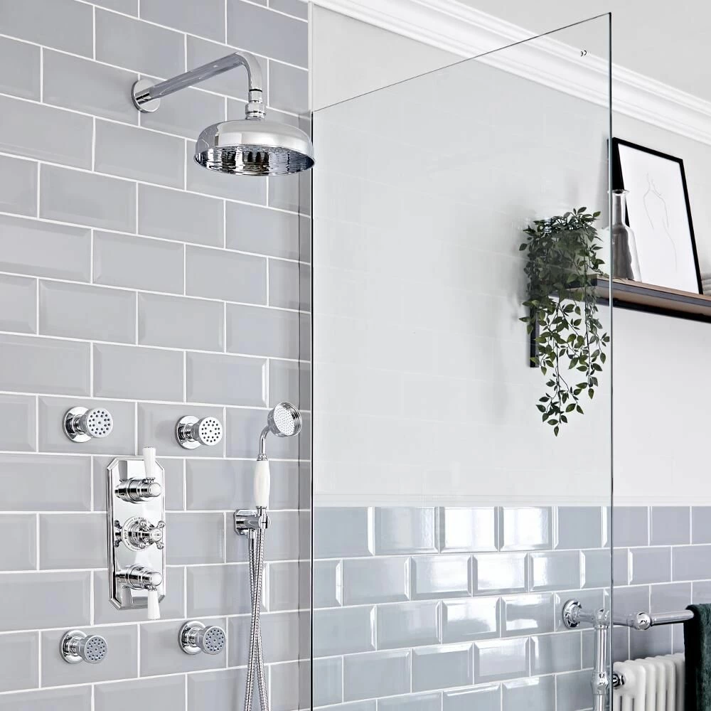 Crafted from solid brass for guaranteed durability, the shower valve supplies water to three outlets, such as a fixed shower head, hand shower and body jets. The valve operates two outlets separately or simultaneously and can divert to a third outlet. Incorporating anti-scald technology to ensure a safer showering experience, the Elizabeth thermostatic shower valve has a hard-wearing chrome finish and white ceramic details.