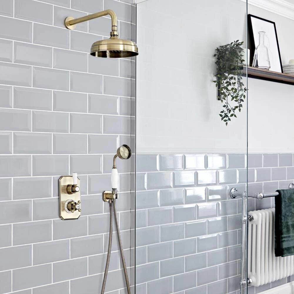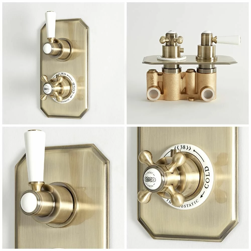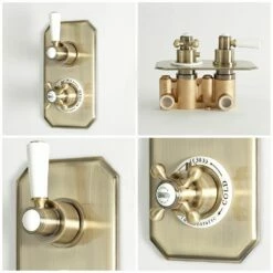 The Milano Elizabeth brushed gold concealed thermostatic twin diverter shower valve blends traditional design with modern showering functionality.