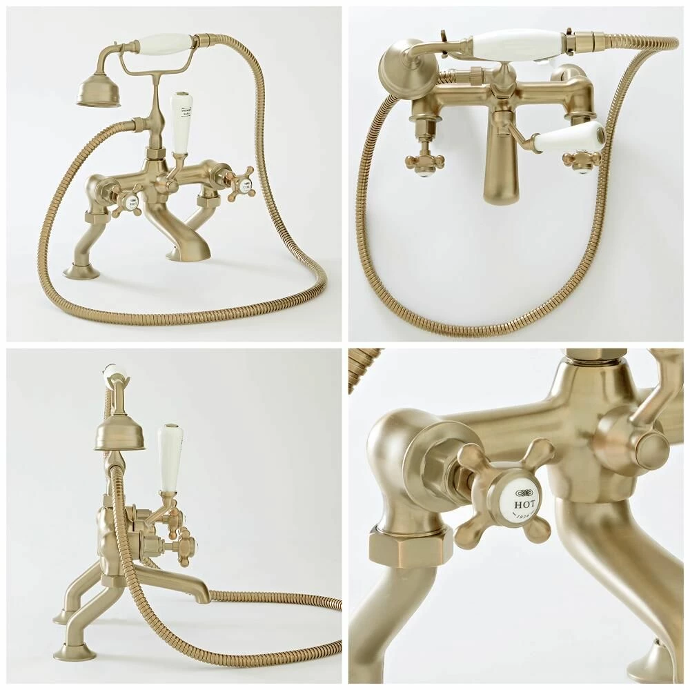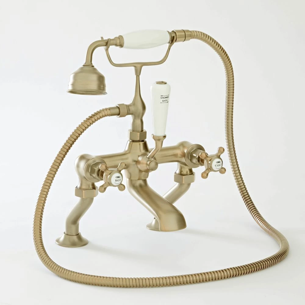 Featuring a brushed gold finish for that true traditional look, this bath shower mixer tap has been crafted from solid brass, giving you a long-lasting quality product. The crosshead handles add a classic touch and provide effortless control, while the moisture blemish resistant finish means less annoying water spots.