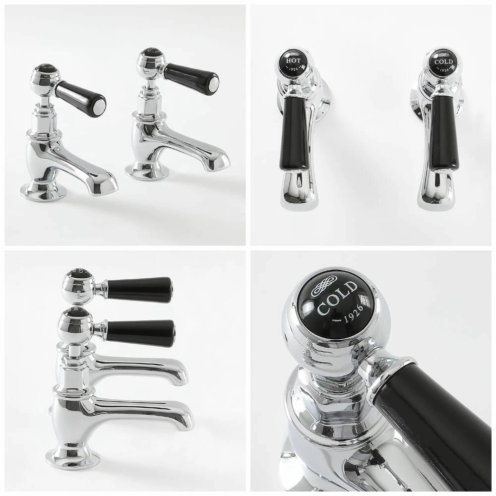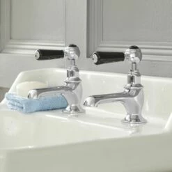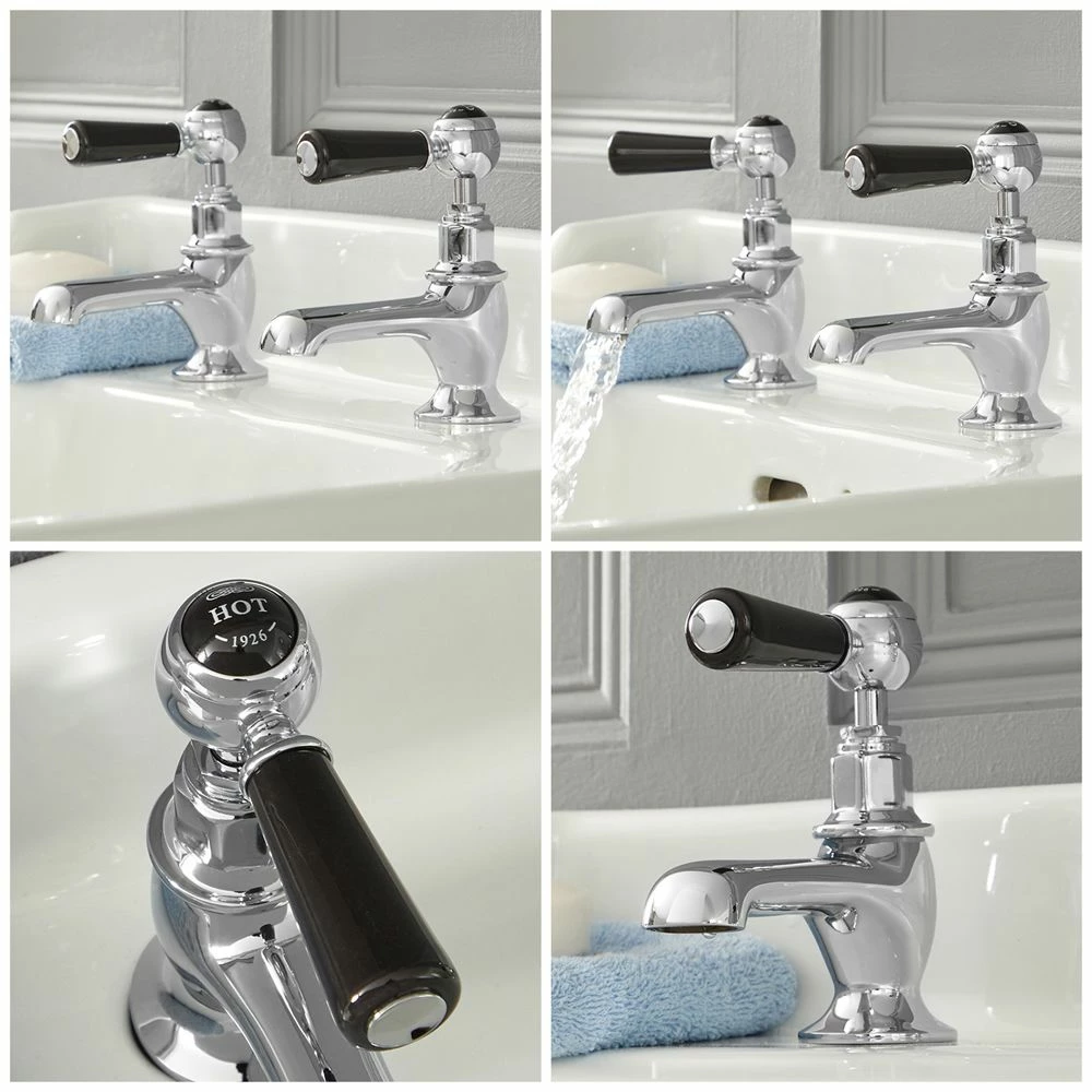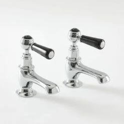 Made from solid brass, these basin taps feature a hard-wearing chrome finish and an elegant design that will never go out of fashion. The stylish black ceramic lever handles provide effortless flow control.