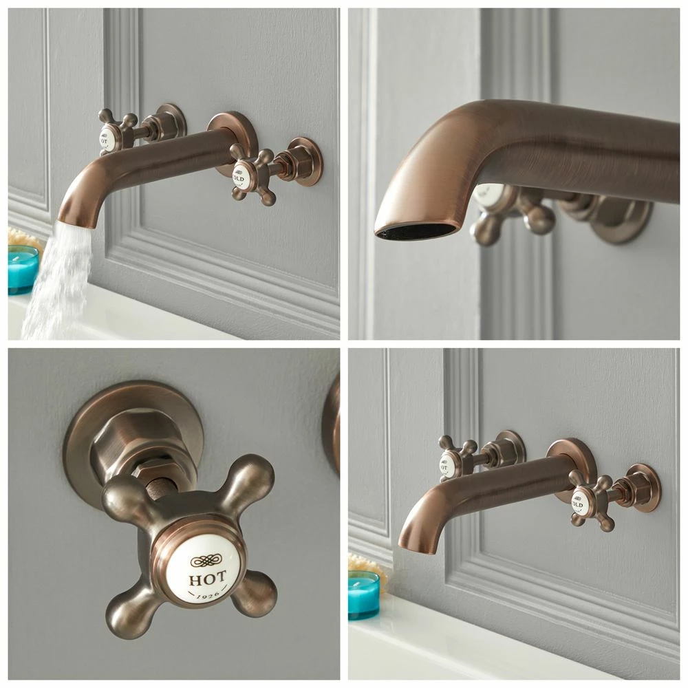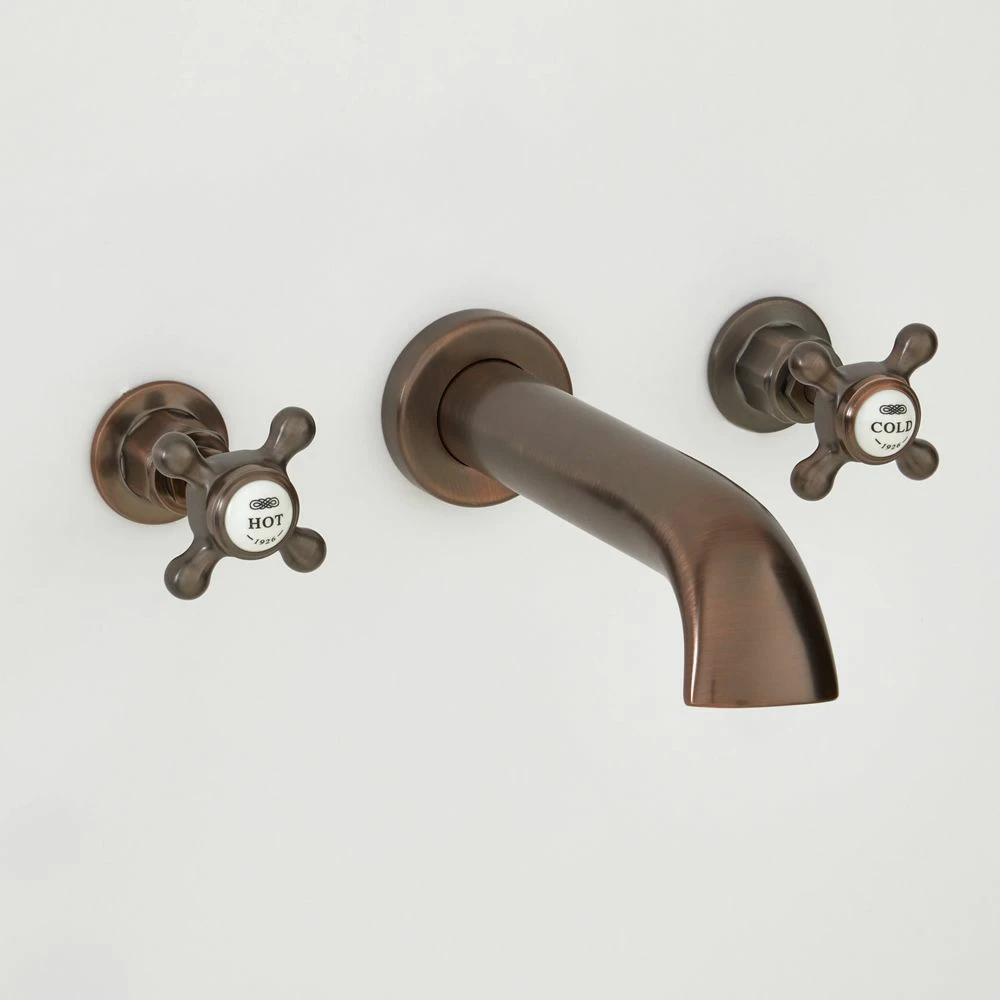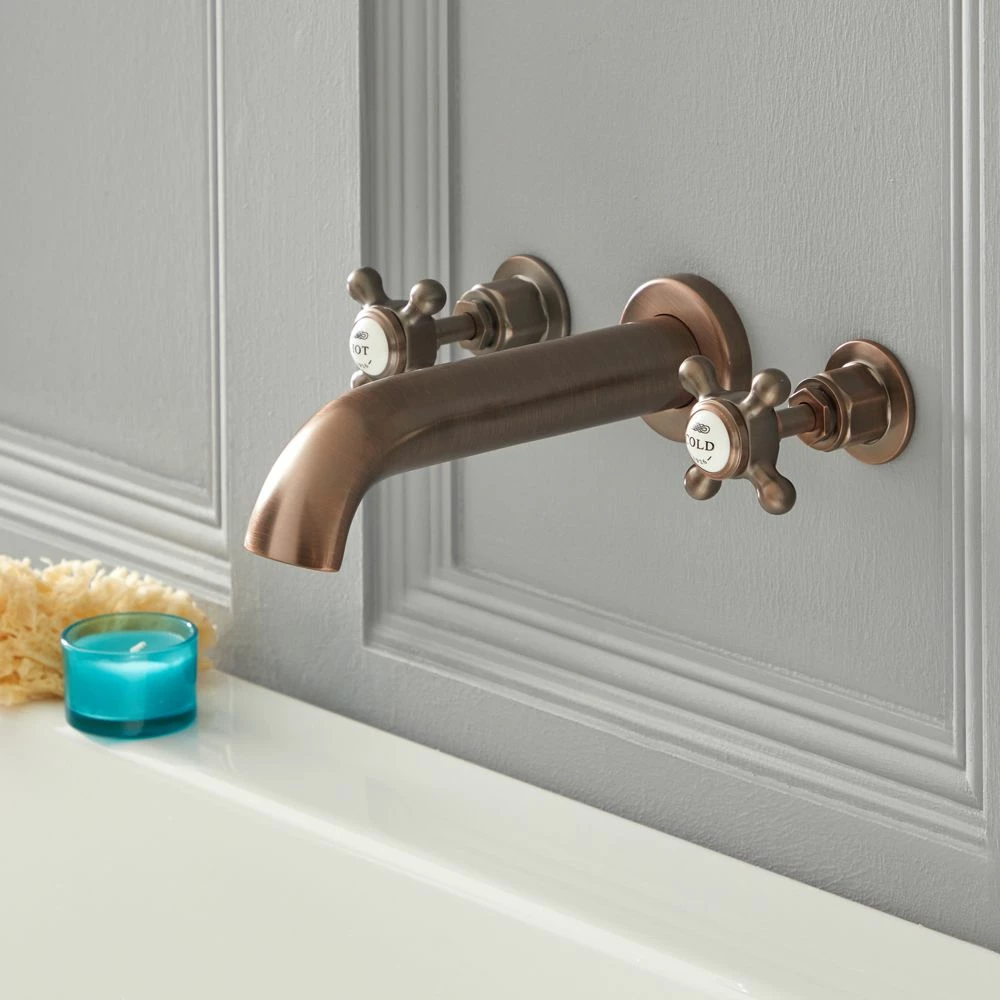 Made from solid brass for guaranteed durability, this timeless bath filler tap features crosshead handles with detailed ceramic indices and a beautiful oil rubbed bronze finish, which is moisture blemish resistant, so less of those unsightly water spots. The wall-mounted style of the tap maximises the surface space around your bath, creating a neater finish.