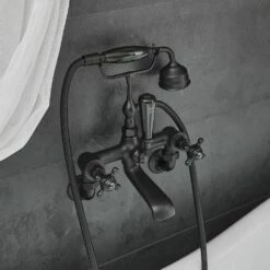 This beautifully crafted bath tap features a wall-mounted design, helping to free up surface space around your bath for an uncluttered look. Made from solid brass for guaranteed durability, the tap has a hard-wearing matt black finish and crosshead handles with ceramic indices.