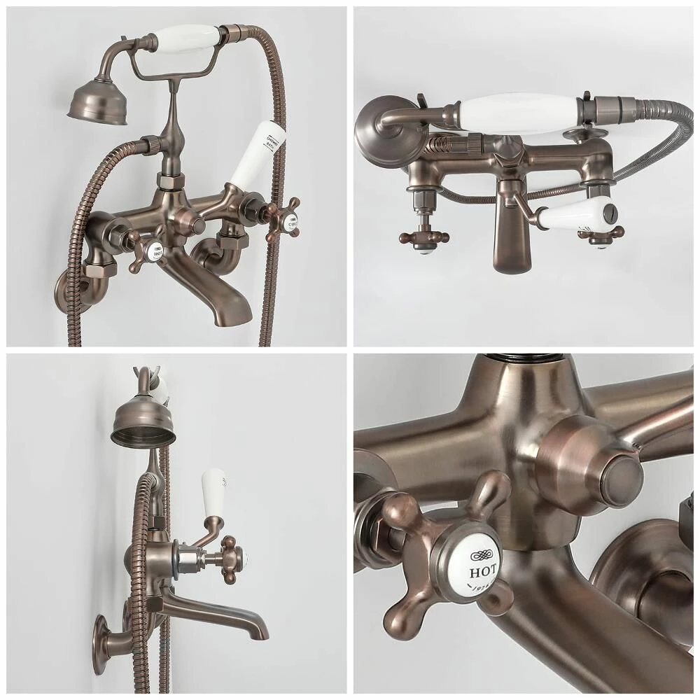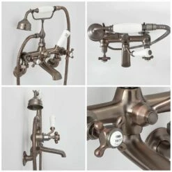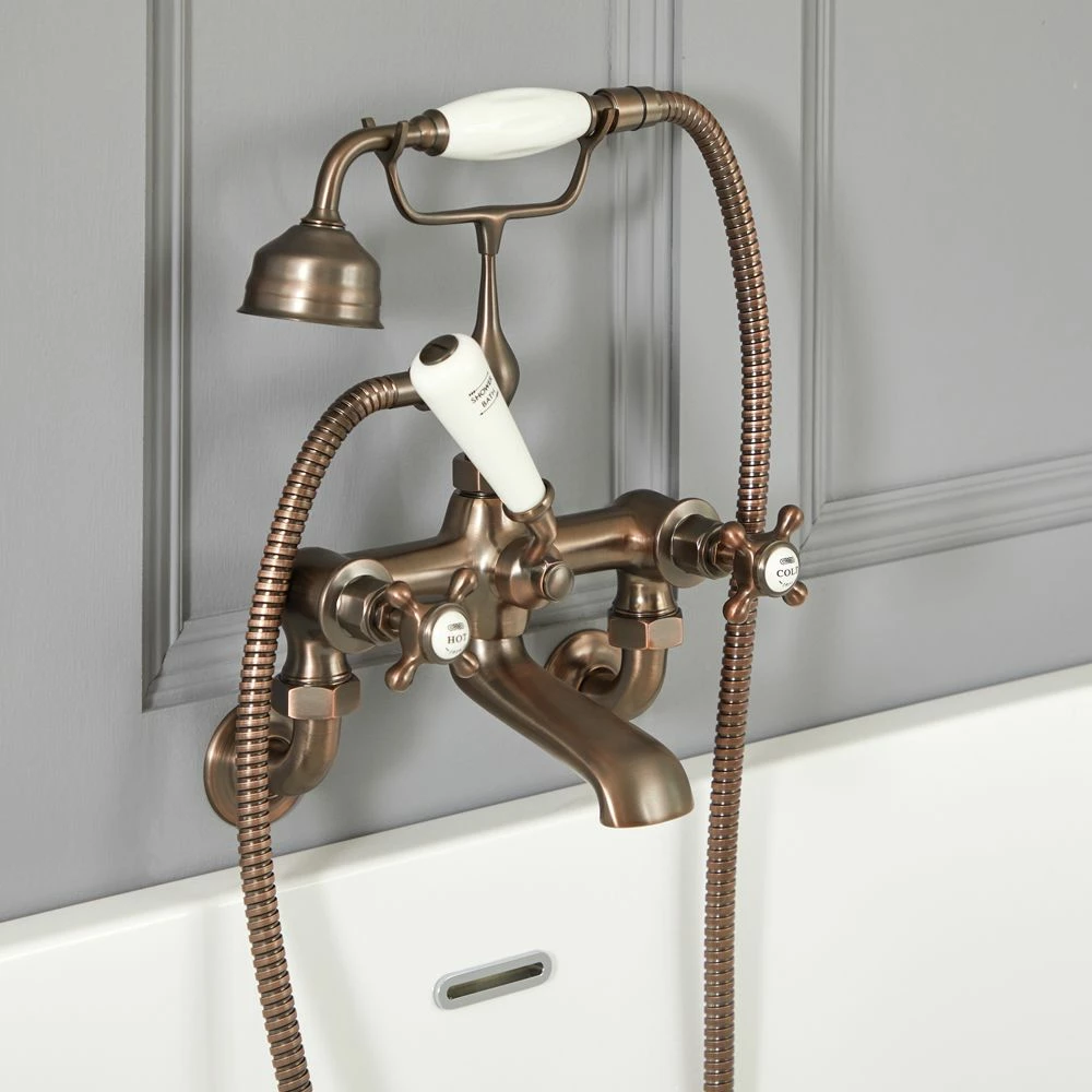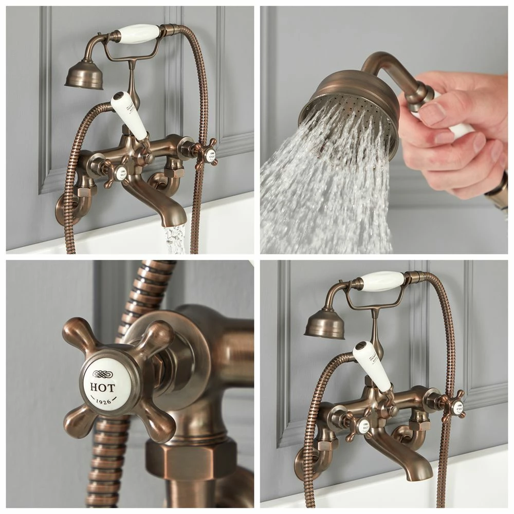 Crafted from solid brass, this bath shower mixer tap, complete with hand shower and 1.5m hose, features a wall mounted design, creating a neater finish and maximising surface space around your bath. The antique brass finish is moisture blemish resistant, so less of those annoying water spots.