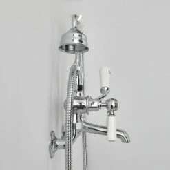 Crafted from solid brass and featuring ceramic lever handles that provide effortless control, this bath shower mixer tap is available in a choice of hard-wearing finishes including chrome/black and chrome/white to perfectly complement your bathroom décor – just make your selection from the above options.