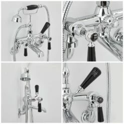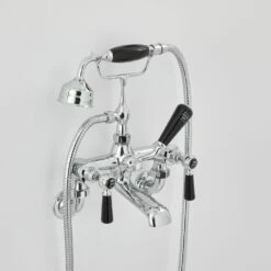 Crafted from solid brass for guaranteed durability, this bath shower mixer tap, complete with hand shower and 1.5m hose, will grace your bathroom with elegance. The wall-mounted design frees up surface space around your bath, creating a neater finish, while the stylish black ceramic lever handles provide effortless control.