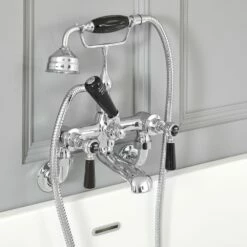 Crafted from solid brass for guaranteed durability, this bath shower mixer tap, complete with hand shower and 1.5m hose, will grace your bathroom with elegance. The wall-mounted design frees up surface space around your bath, creating a neater finish, while the stylish black ceramic lever handles provide effortless control.
