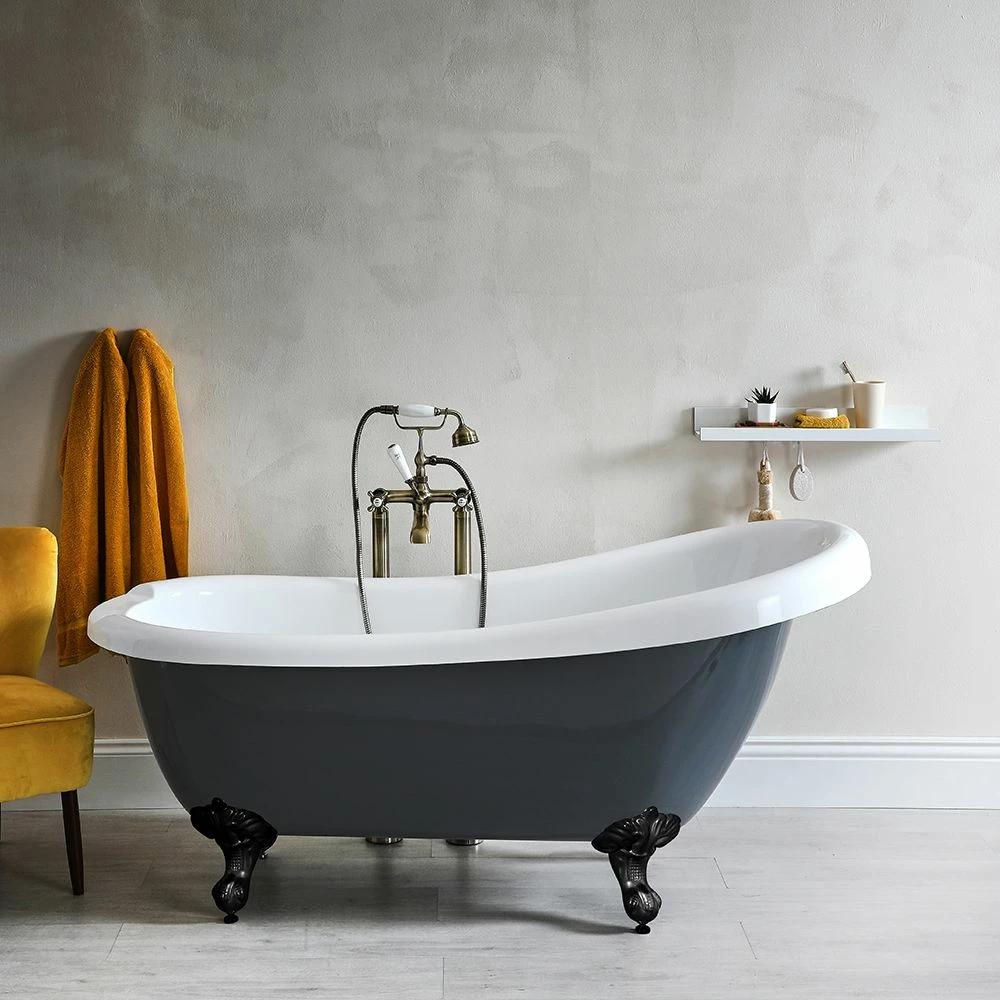 An eye-catching centrepiece for your bathroom, this stunning freestanding bath features a beautiful slipper style design and a stone grey exterior. The decorative black feet enhance the look further and add a touch of opulence.
