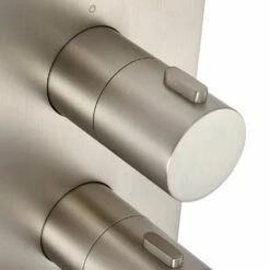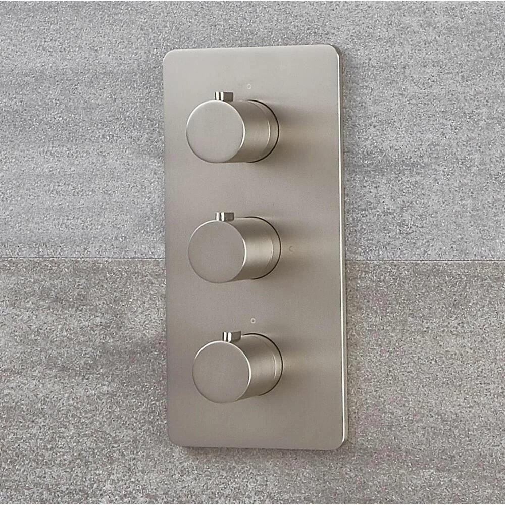 The Milano Hunston triple thermostatic shower valve features a brushed nickel finish and a neat, modern design.