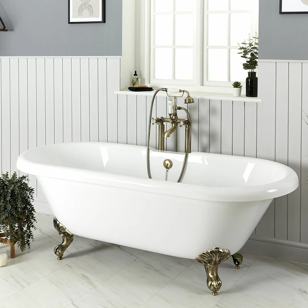 A stunning centrepiece for your bathroom, this freestanding bath features a roll top rim and a double-ended design for the most comfortable bathing experience. The decorative brushed gold feet enhance the look of the bath perfectly and add a touch of opulence too.