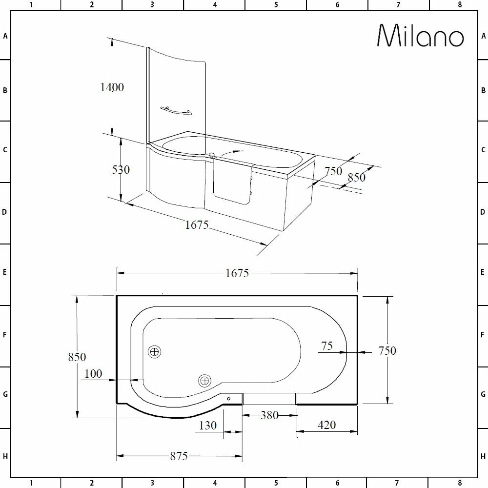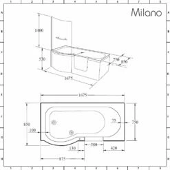 - Bath Dimensions: L 1675mm x W 850mm x H 530mm