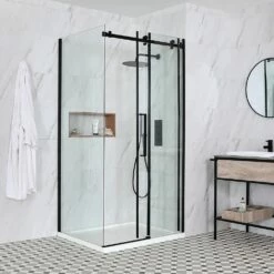 Make a style statement with the stunning Milano Nero black frameless sliding door shower enclosure, complete with 800mm glass side panel and tray with fast-flow waste.