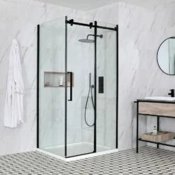 Make a style statement with the stunning Milano Nero black frameless sliding door shower enclosure, complete with 800mm glass side panel and tray with fast-flow waste.