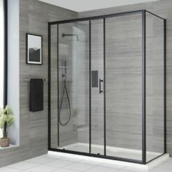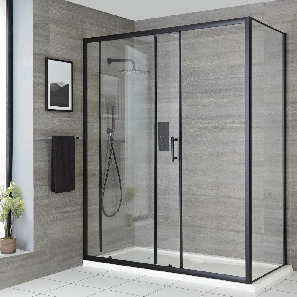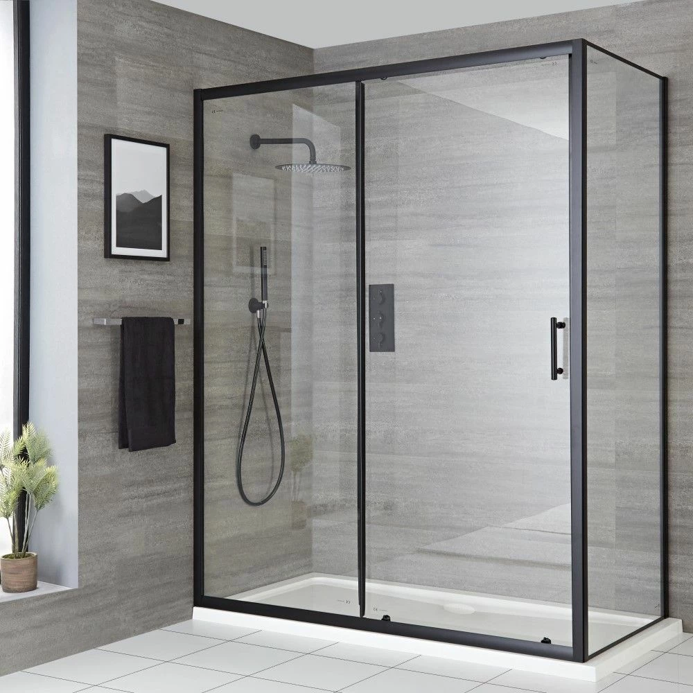 Featuring a contemporary matt black frame finish, this corner sliding door enclosure uses toughened glass for excellent strength and double rollers to ensure a smooth opening action.