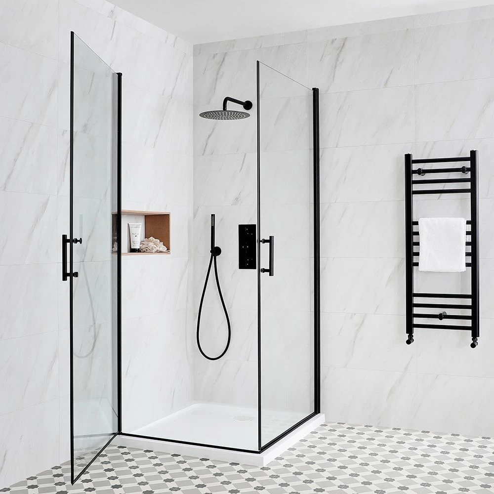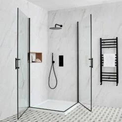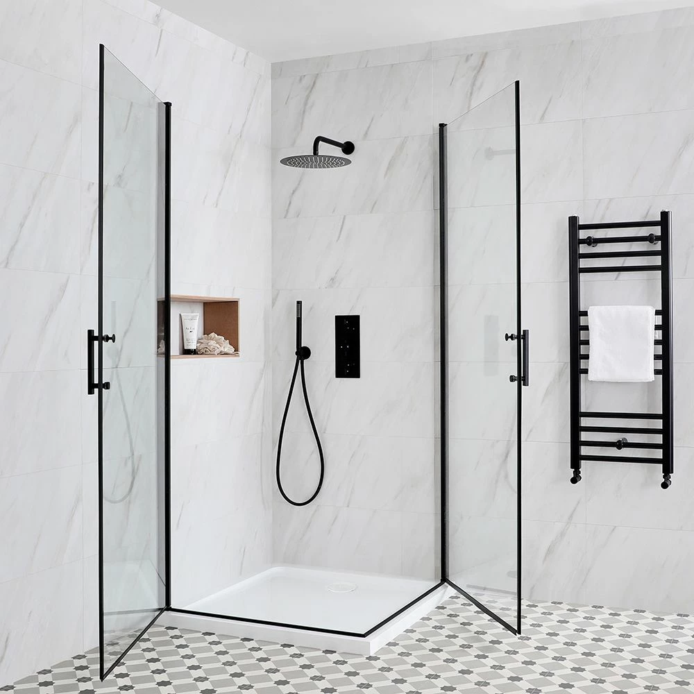 With a matt black profile for a bold yet sophisticated look, the Milano Nero hinged double door corner shower enclosure, complete with tray and fast-flow waste, is the perfect combination of style and functionality.