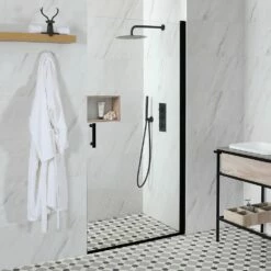 This shower enclosure features a single hinged door, which uses 6mm toughened glass for excellent strength and durability. It has a matt black profile for a bold, modern look and measures 1950mm in height, helping to contain more shower splashes.