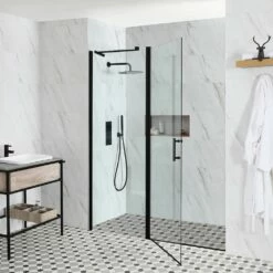 This shower enclosure features a single hinged door, which uses 6mm toughened glass for excellent strength and durability. It has a matt black profile for a bold, modern look and measures 1950mm in height, helping to contain more shower splashes.