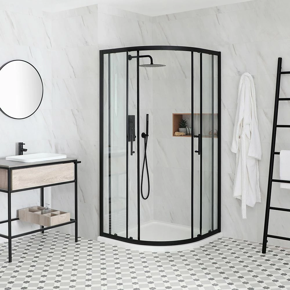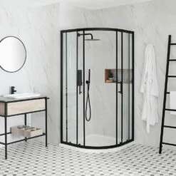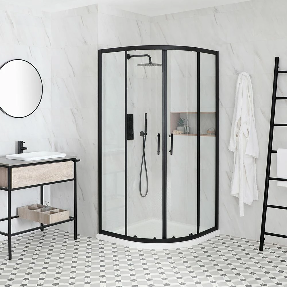 Create a contemporary look and make a statement in your bathroom with the Milano Nero black quadrant shower enclosure. Featuring a matt black frame finish, this tough and durable shower enclosure fits neatly into the corner of your bathroom to maximise space. The 6mm toughened glass provides superb strength, while the magnetic seal ensures the doors stay shut and watertight.