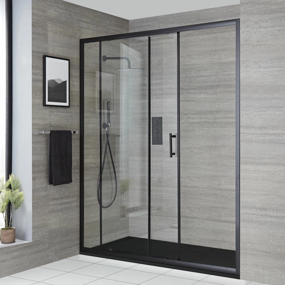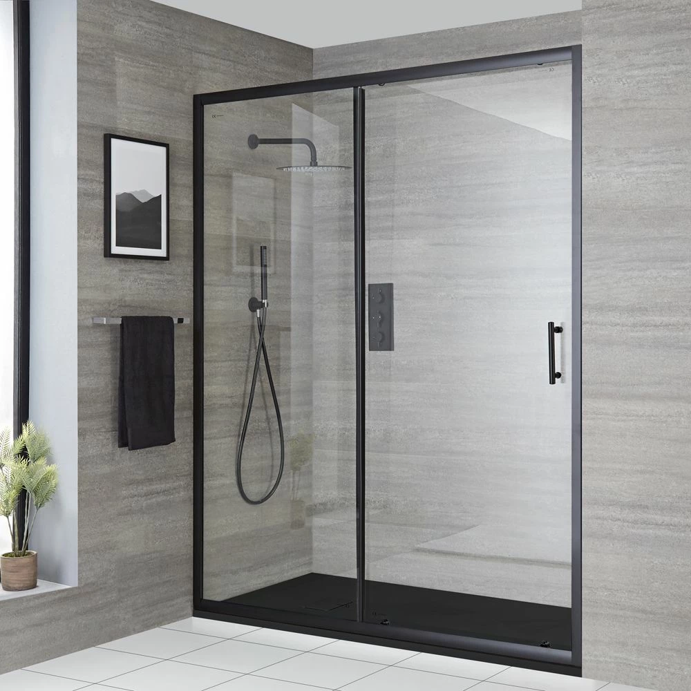 A great option for creating a contemporary look, the black sliding shower door features toughened glass for excellent strength and double rollers to ensure a smooth opening action. The magnetic seal helps the door stay shut and watertight, while the 1950mm height contains more shower splashes.