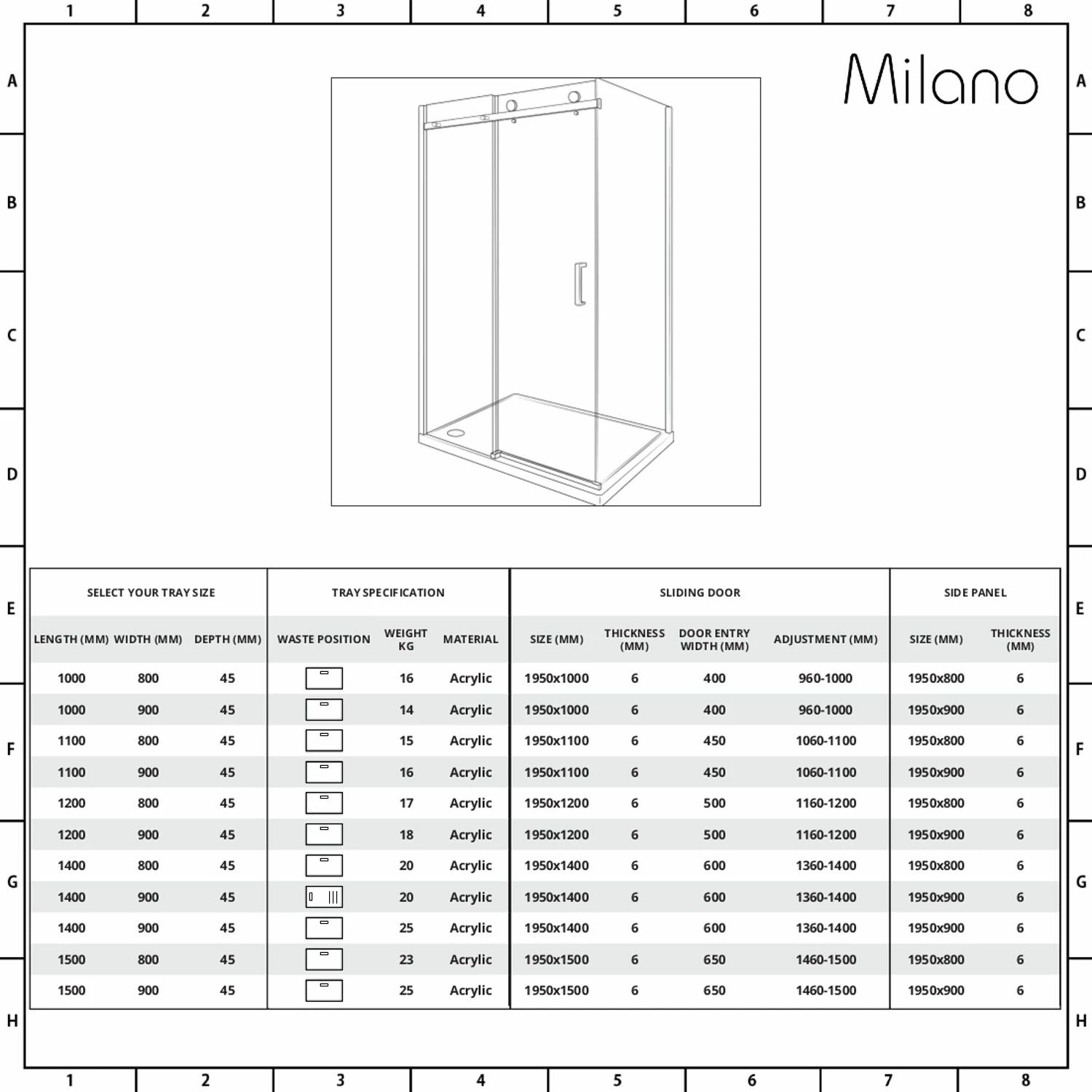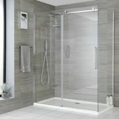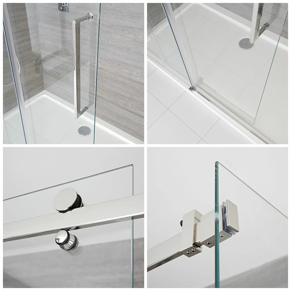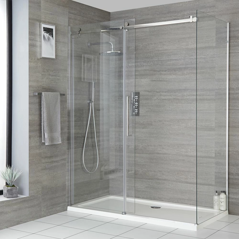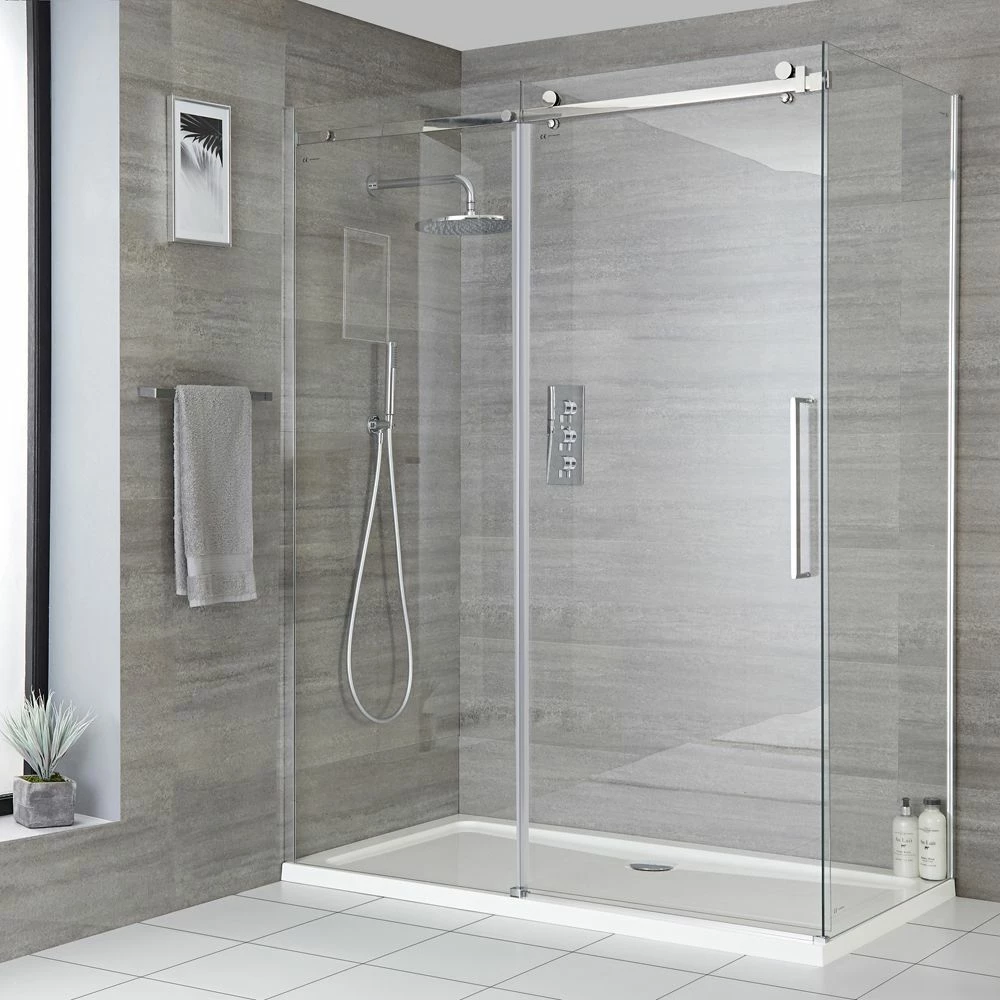 Smarten up your bathroom and create a modern and stylish showering space with the complete Milano Portland corner frameless sliding shower door enclosure and tray with fast-flow waste.