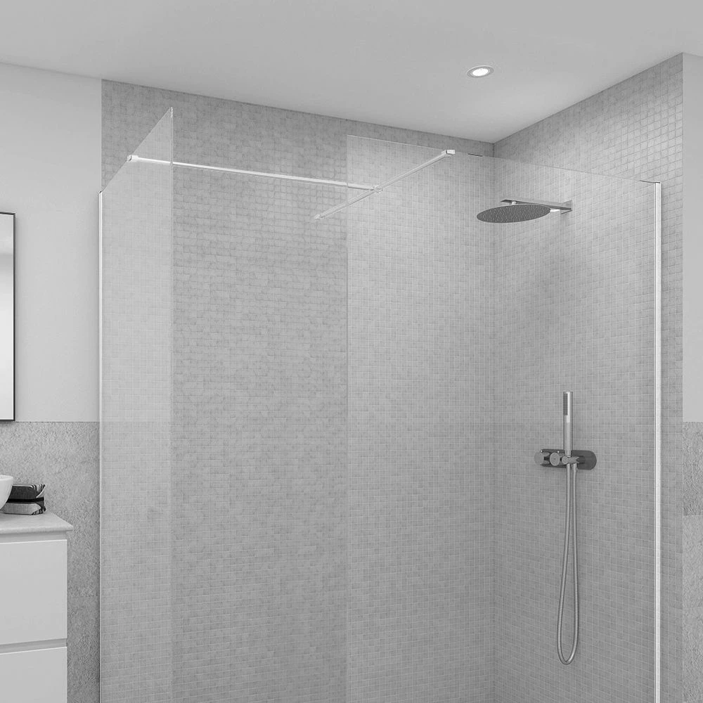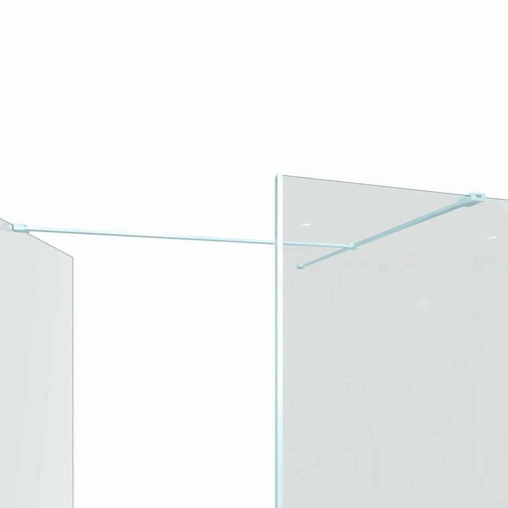 This corner walk-in shower uses 8mm toughened glass for excellent strength and a luxury feel. The glass screens have a height of 2000mm and feature a matt white profile and support arms, creating a minimal look.